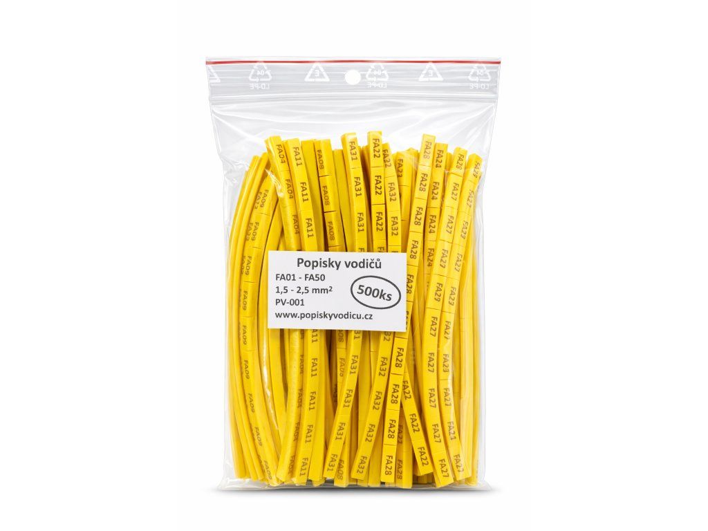 Balení obsahuje 500 ks bužírek s popisem FA01 až FA50 a z každého znaku je 10 ks. Jedno balení vyjde na popsání dvou až tří rozvaděčů s padesáti okruhy v závislosti na počtu žil v kabelu. Z 90% jsou kabely tří žílové a balení vyjde na tři rozvaděče. Jednotlivé bužírky jsou nařezané a lze je jednoduše odtrhnout. Zakoupením již hotových bužírek ušetříte nemálo času a jak všichni víme, čas jsou peníze.
